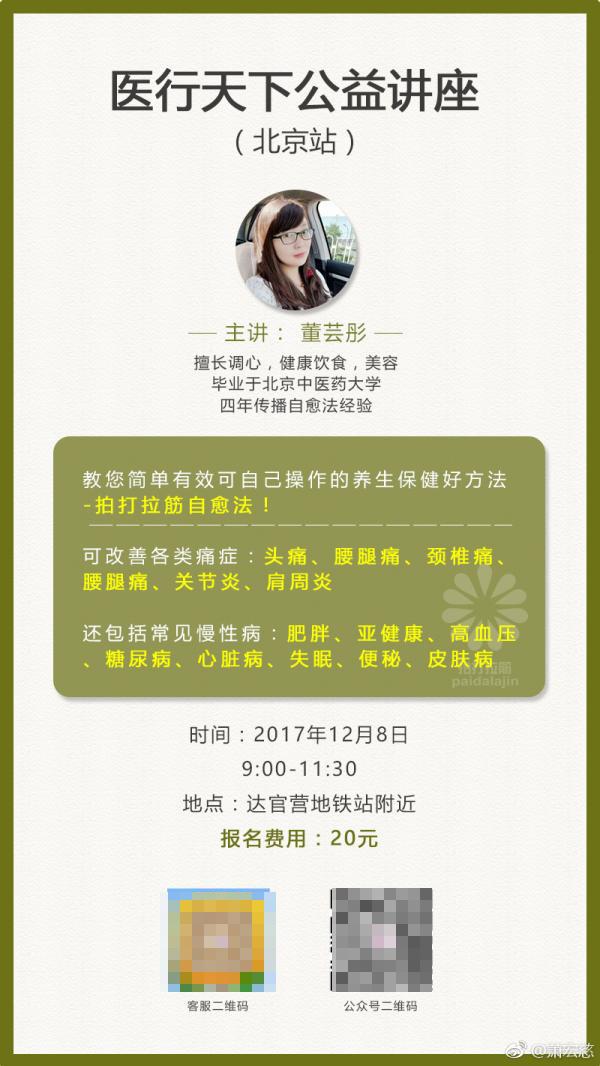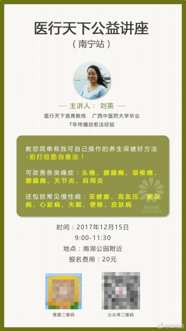 其置頂微博直截了當地為收費的拍打療法體驗營宣傳,內容為2017年12月-2018年2月南寧、上海、深圳、鄭州、北京體驗營的時間安排。