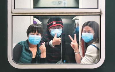 圖為10月29日,滯留游客離開內(nèi)蒙古額濟(jì)納旗時(shí),在列車車廂里與地面人員告別。