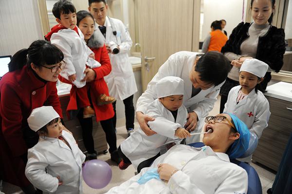東陽橫店某醫院口腔科內,孩子們穿上白大褂,變身“小小牙醫”,在醫生的指導下學習如何正確刷牙、預防牙科疾病。  浙江新聞客戶端圖