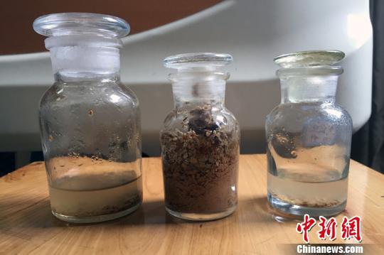 從鄒先生右腎內(nèi)取出的結(jié)石幾乎裝滿其中一只玻璃瓶。陳松 攝