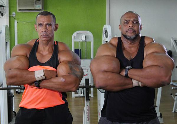 照片的主人公是49歲的托尼•浩克•杰拉爾多和50歲的阿爾瓦羅•科南•珀雷拉,兄弟二人為了讓肌肉變得盡可能大,從青少年時期就開始注射化學藥劑。阿爾瓦羅從15歲起就開始注射化學藥劑,托尼在親眼見證藥品為哥哥的肌肉帶來的改變后,在18歲以后也開始使用化學藥劑。現在哥哥的肱二頭肌圍度已經達到了驚人的28英寸(約合71厘米)。