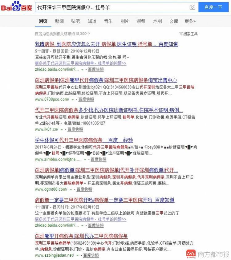 在百度檢索“深圳、病假條”兩個(gè)關(guān)鍵詞,便會(huì)跳出不少關(guān)于“深圳開病假條”、“深圳代開醫(yī)院病假單”等鏈接,數(shù)量不少。