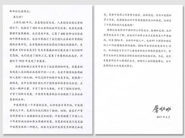 調研中,2015年諾貝爾生理學或醫學獎、2016年度國家最高科學技術獎得主,86歲的中國中醫科學院(中藥研究所)終身研究員、青蒿素研究中心主任屠呦呦給新華社記者寫來一封信,講述發現“青蒿素”這份“中國傳統醫藥獻給人類的禮物”的艱辛過程,表達壯大和發展中醫藥、造福全人類的決心。