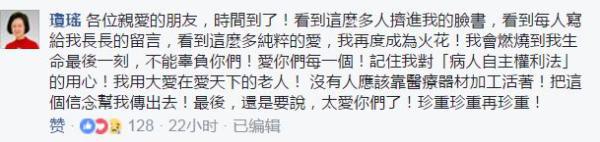 瓊瑤發(fā)文稱:“各位親愛的朋友,時(shí)間到了!看到這么多人擠進(jìn)我的臉書,看到每人寫給我長長的留言,看到這么多純粹的愛,我再度成為火花!我會(huì)燃燒到我生命最后一刻,不能辜負(fù)你們!愛你們每一個(gè)!記住我對(duì)‘病人自主權(quán)利法’的用心!我用大愛在愛天下的老人! 沒有人應(yīng)該靠醫(yī)療器材加工活著!把這個(gè)信念幫我傳出去!最后,還是要說,太愛你們了!珍重珍重再珍重!”