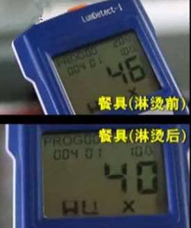 首先,用100℃開水對餐具進行淋燙,再對細菌數(shù)值(RLU,相對光單位)進行檢測。其次,測試儀結果顯示具表面細菌數(shù)值為40RLU。