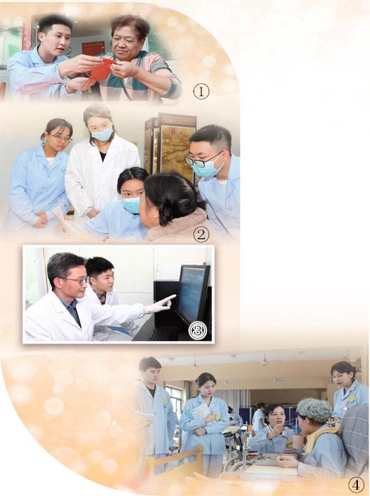 圖④:長沙民政職業(yè)技術(shù)學(xué)院智慧健康養(yǎng)老教師團隊成員、主管護師謝海艷(右三)在實訓(xùn)室給學(xué)生講授老年人生活照護技術(shù)。
