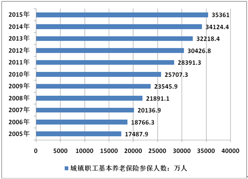 2005~2015年中國城鎮職工基本養老保險參保人數情況