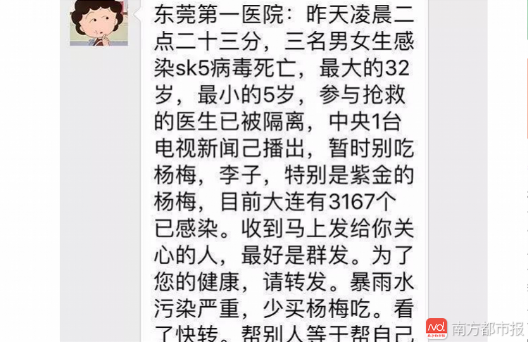 南都訊記者肖佩佩今天早上,你的朋友圈除了被暴雨刷屏,會(huì)不會(huì)突然發(fā)現(xiàn)有這么一則消息熱傳——稱東莞第一醫(yī)院發(fā)現(xiàn)SK5病毒疫情,已有多人死亡。資料圖該內(nèi)容隨后在朋友圈和微信群中傳播,