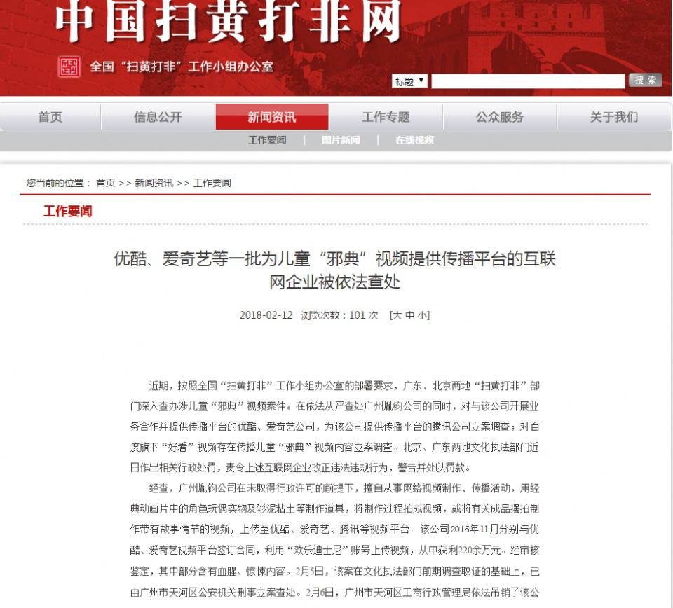 近期,按照全國“掃黃打非”工作小組辦公室的部署要求,廣東、北京兩地“掃黃打非”部門深入查辦涉兒童“邪典”視頻案件。在依法從嚴查處廣州胤鈞公司的同時,對與該公司開展業務合作并提供傳播平臺的優酷、愛奇藝公司,為該公司提供傳播平臺的騰訊公司立案調查;對百度旗下“好看”視頻存在傳播兒童“邪典”視頻內容立案調查。北京、廣東兩地文化執法部門近日作出相關行政處罰,責令上述互聯網企業改正違法違規行為,警告并處以罰款。