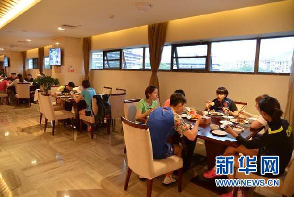 湖北黃石乒乓球訓(xùn)練基地國(guó)乒餐廳,中國(guó)女子乒乓球隊(duì)運(yùn)動(dòng)員們?cè)谶M(jìn)餐。新華網(wǎng)發(fā)張姣攝
