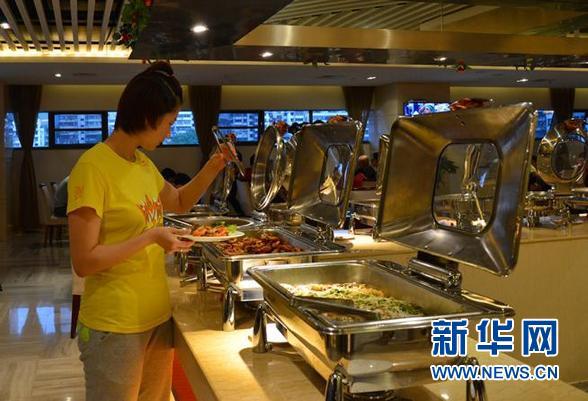 湖北黃石乒乓球訓(xùn)練基地國(guó)乒餐廳,女子乒乓球世界冠軍、奧運(yùn)冠軍丁寧在選擇餐食。新華網(wǎng)發(fā)張姣攝