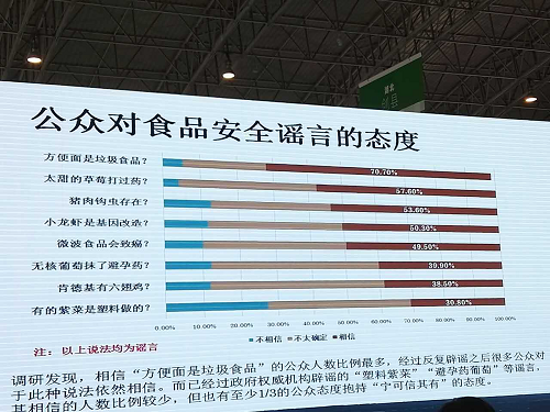 北京師范大學新聞傳播學院執行院長喻國明現場解讀《中國食品安全傳播力報告》,其中肉制品是公眾最擔憂的食品類別,公眾了解食品安全信息的首要渠道是人際渠道61.96%(包括專家和家人),而政府官方機構則僅占3.55%,70后和80后更傾向于不相信謠言,而50后和60后等50歲以上老年人,最容易受到食品藥品謠言影響。