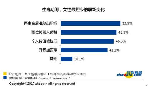 10日,智聯招聘發布《2017年職場媽媽生存狀況調查報告》,分別從生育意愿、職業發展影響、職場媽媽福利情況等多個方面進行了調查,共回收40210份有效問卷。調查顯示,超過六成職場女性認為生育對女性職場發展影響很大,還有六成女性不愿做全職媽媽,害怕脫離社會。