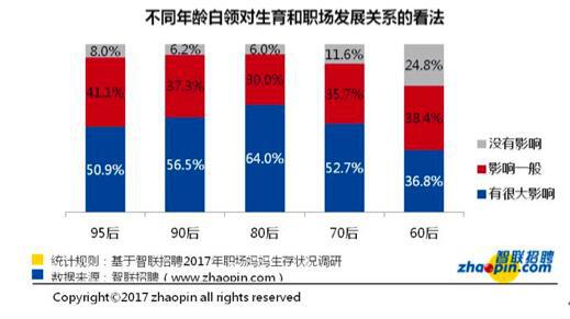 智聯招聘重慶市場部經理范靜認為,這可能與不同年齡段白領目前面臨的家庭生命周期狀況有關。作為新銳中產群體的主力軍,80后普遍處于“上有老下有小”的雙重壓力下,生育對職業女性的工作影響程度較大,如果事業正在上升關鍵期,生育很有可能讓職業女性失去晉升或接受新挑戰的機會。