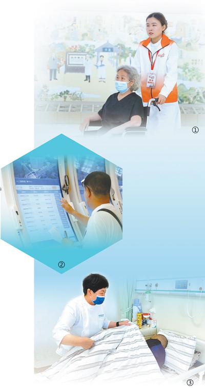 圖①:江蘇省中醫院為80歲以上老人提供就醫零等待服務。圖為敬老接待專人在送腿腳不便的老人就醫。