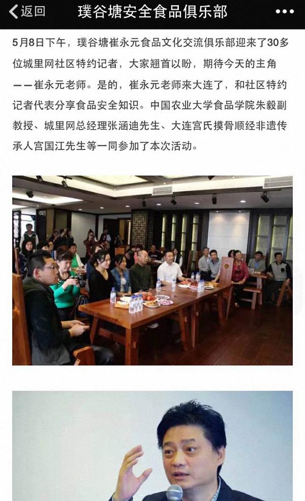 那么,與這些企業相關的崔永元是否就是前央視主持人崔永元呢?澎湃新聞(www.thepaper.cn)發現微信公眾號“璞谷塘安全食品俱樂部”5月12日曾發布一篇文章,記錄了“崔永元老師來大連了,和社區特約記者分享食品安全知識”,并配有崔永元的現場照片。