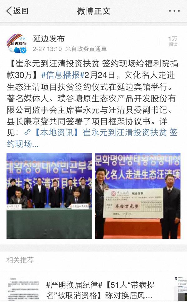 而延邊人民政府新聞辦公室官方微博“延邊發布”在2月27號發布資訊,提到“著名媒體人、璞谷塘原生態農產品開發股份有限公司監事會主席崔永元與汪清縣委副書記、縣長廉京燮共同簽署了項目框架協議書。”