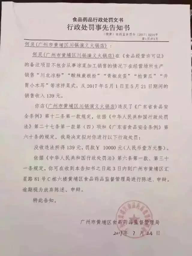“拍黃瓜”、“青椒皮蛋”、“川北涼粉”都是大家在外就餐經常會點的涼菜,但是近日,廣州黃埔區一間火鍋店因超出許可范圍售賣這些涼菜,收入139元,卻被通知行政處罰1萬元,這份處罰告知書不僅讓媒體和公眾不解,餐飲企業和部分監管者也很吃驚。