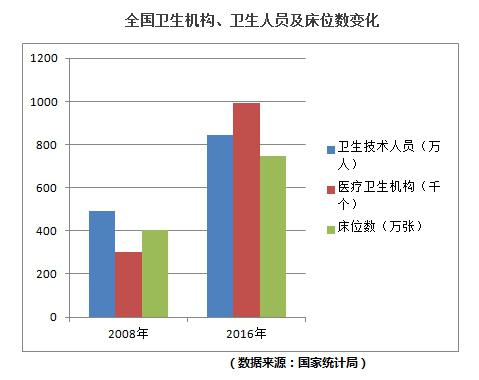 2008年,全國共有衛生機構30.0萬個,衛生技術人員492萬人,床位數403萬張。到了2016年,醫療衛生機構增長到99.3萬個,衛生技術人員也擴大到了844萬人,床位數提升至747萬張。