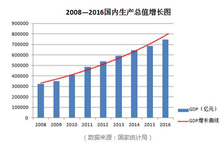 2008年到2016年,中國國內生產總值從319516億增長到744127億,人均GDP也由24121元增到53817元。增速上,從2008年的9.7%降低至2016年的6.7%,預計2017年為6.5%,進入L型拐點。