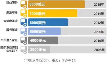 值得一提的是,2008年中國人均GDP首次突破3000美元,達到3315美元,開始出現較為明顯的居民消費結構升級趨勢,相關的消費及服務類行業出現明顯的上升勢頭,在2015年人均GDP突破8000美元,消費進入了“精益服務”階段。
