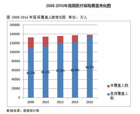 據國家統計局數據,2008年,參加城鎮基本醫療保險的人數31698萬人。2729個縣(市、區)開展了新型農村合作醫療工作,新型農村合作醫療參合率91.5%。2016年,參加城鎮基本醫療保險人數74839萬人,覆蓋面比2008年提升了1.3倍。