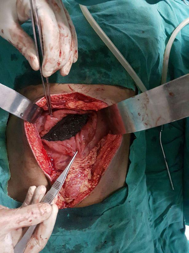 她是在吃飯時常常不斷嘔吐而去醫院做了X光檢查,結果令人震驚:一個巨大的腫塊占據了她胃里80%以上的空間。