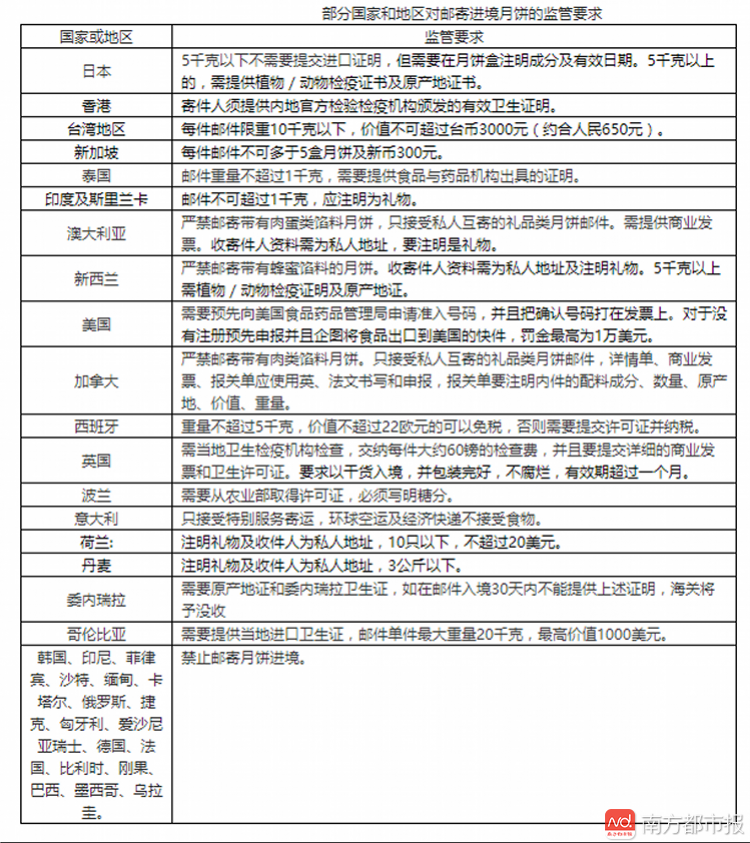一些國家雖然允許月餅郵寄入境,但限制很多。南都記者從國內一家快遞公司獲悉,郵寄到日本的月餅必須是從個人到個人,月餅成分不能含有肉、蛋。