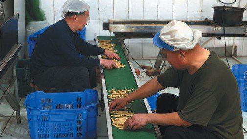 5 月3 日,北京祥隆宮食品有限公司第一分公司,工人直接用手整理辣條半成品。