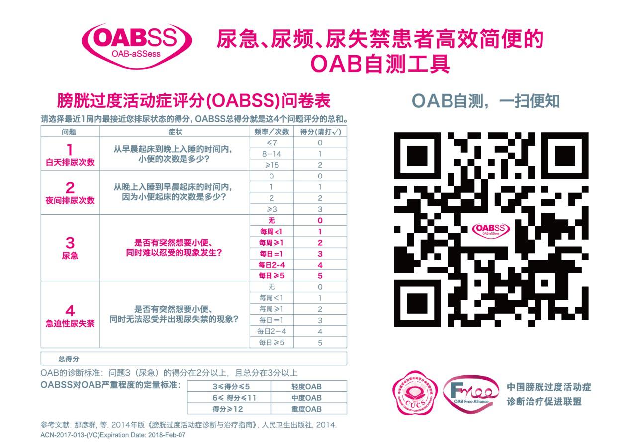 同時,為了幫助更多飽受尿急、尿頻等OAB癥狀困擾的患者得到快速、有效的診斷和規范的治療,由中華醫學會泌尿外科學分會(CUA)、CUA尿控學組(CUCS)、中國膀胱過度活動癥診斷治療促進聯盟(OAB Free Alliance)共同發起了我國首個OAB 患者云端管理項目(OAB Cloud)。該項目借助移動互聯網及智能軟件的應用,通過OABSS有效篩查OAB患者,并可實時追蹤患者的治療效果。