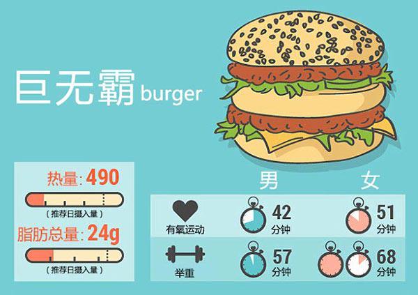 吃掉一個巨無霸,為了抵消490卡路里和24克脂肪,男人要做42分鐘的有氧運動或近1小時的舉重,女人則要做51分鐘的有氧運動或1小時8分鐘的舉重。