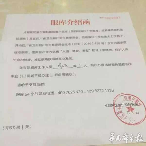 周女士系儀隴土門鎮(zhèn)人,今年48歲,在南充某公司工作,丈夫在北京打工,兒子小鄧在成都讀研。媽媽突然離世,小鄧悲痛萬分。28日晚上9點(diǎn),小鄧趕到南充。途中悲痛萬分的小鄧決定:捐出媽媽的眼角膜,讓天堂里的媽媽繼續(xù)看世界。于是他聯(lián)系紅十字會(huì)……