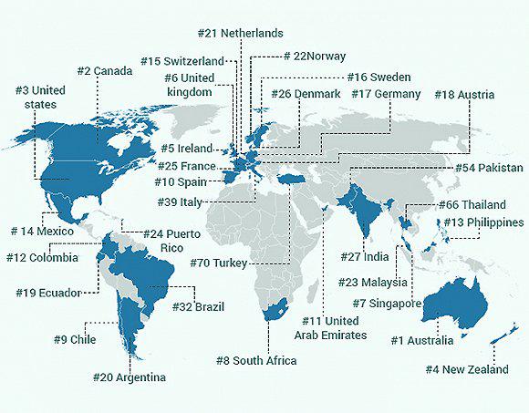 按照以上條件得出的研究結果如下圖。可以看到,對健康觀念最有興趣的前10個國家是:澳大利亞、加拿大、美國、新西蘭、愛爾蘭、英國、新加坡、南非、智利、西班牙。對健康觀念興趣最低的10個國家則包括(排名從后往前):尼泊爾、孟加拉國、巴林、敘利亞、波黑、阿曼、斯里蘭卡、卡塔爾、突尼斯、伊拉克。