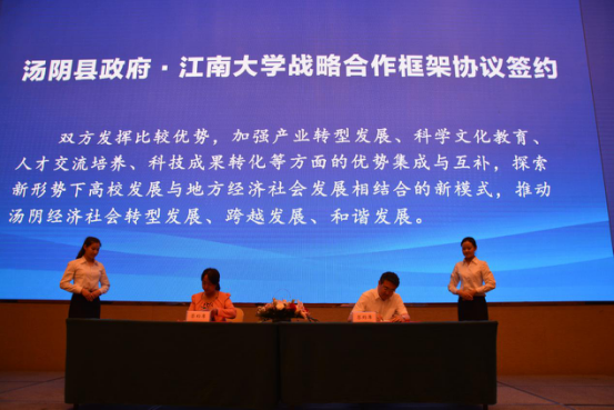 會上,湯陰縣委副書記、縣長賈曉軍先后參加了3個簽約項目。一個是與江南大學地方服務與合作辦公室主任孔祥進行的江南大學與湯陰縣政府戰略合作框架協議簽約儀式。一個是與益海嘉里集團面粉事業部中國中區質量負責人、益海嘉里(安陽)食品工業有限公司副總經理王煜霞進行的益海嘉里食品工業有限公司面粉生產基地項目簽約儀式。一個是與河南陽光油脂集團安陽糧油食品有限公司總經理牛斯源進行的河南陽光油脂集團冷軋濃香花生油生產基地項目簽約儀式。