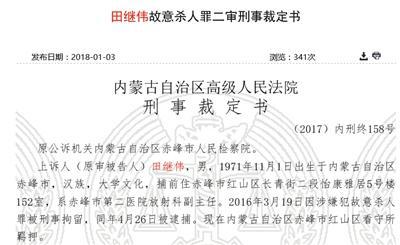 2017年12月25日,內蒙古自治區高級人民法院二審裁定駁回上訴,維持田繼偉無期徒刑的原判決。中國裁判文書網截圖