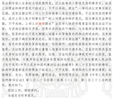法院二審認為,田繼偉采取秘密手段,長時間持續往張某飲水杯中投放自制藥物混合液體,導致張的健康狀況惡化,致張某重傷,張因不堪忍受而過量服用安定類藥物自殺,上訴人田繼偉的行為構成故意殺人罪。且手段卑劣,情節惡劣,后果嚴重,其非法剝奪他人生命的主觀故意明顯,應以故意殺人罪追究其刑事責任,故田繼偉上訴理由和辯護意見不能成立。