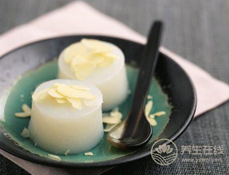 杏仁豆腐是以杏仁制作的傳統藥膳料理,杏仁自古就作為中藥藥方的一種,具有補身潤肺、保養喉嚨,防止肌膚干燥等作用,還可舒緩干咳。而杏仁中含有的脂質具有潤腸效果,可以解便秘。