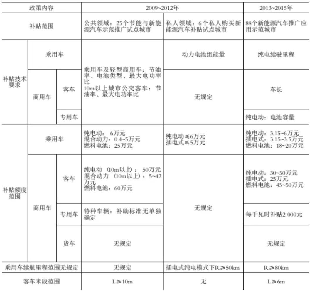 2013年時,補貼政策進(jìn)入推廣應(yīng)用階段,該階段主要依托應(yīng)用示范城市開展新能源汽車推廣應(yīng)用,陸續(xù)發(fā)布兩批共39個城市 (群) 88個新能源汽車推廣應(yīng)用示范城市,對公共服務(wù)領(lǐng)域和私人購買領(lǐng)域新能源汽車購置進(jìn)行補貼。并于2012年起,將混合動力公交客車的補貼范圍推廣到全國所有城市。
