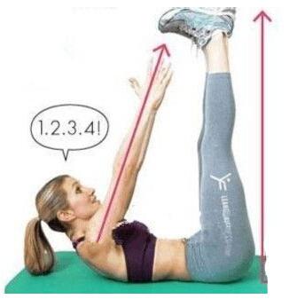頭朝上平躺在平面上,雙手平放在身體兩側(cè),整個身體成一條線,然后雙腿同時慢慢地向上抬,直到抬到與上半身呈直角再慢慢放下,不斷重復(fù)這個動作。