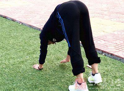 動力拉伸:前弓身.兩腳站距同髖寬.雙手放在頭后.從髖關節屈體向前.保持腰背挺直,直到股二頭肌感到緊張。