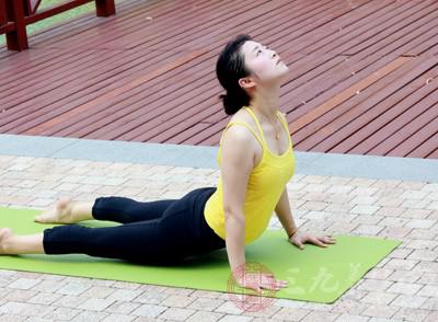 呈弓步式,雙手叉腰,雙腿盡量打開下壓,感覺到大腿后側的肌肉拉伸即可放松,重復。