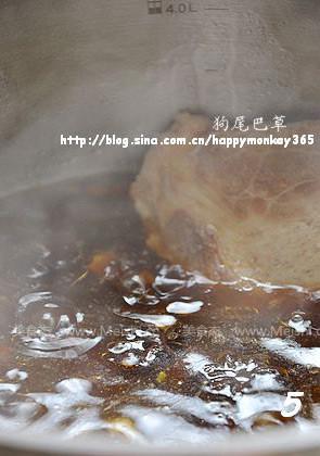 5. 時間到了之后,將牛骨頭撈起,不用。往湯里加2勺老抽,1小勺白糖,適量鹽(鹽不要多,老抽有咸度的)調味,轉大火