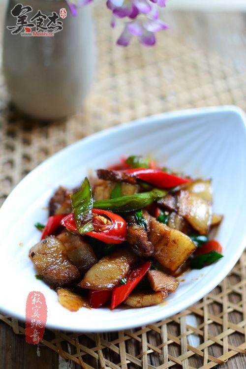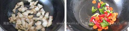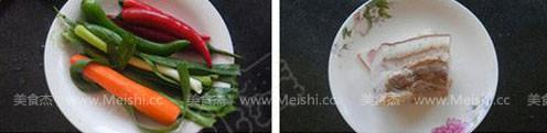 2.煮熟的五花肉切薄片,青紅尖椒切顆粒,青蒜切段,胡蘿卜切細(xì)薄片待用,熱鍋小火放入肉片逼出油