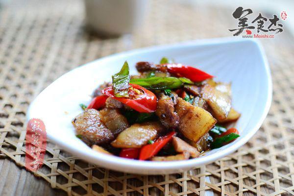 5.加入五花肉片繼續(xù)翻炒片刻,這時(shí)候可以將其他調(diào)料一起放入,起鍋前撒入青蒜段即可