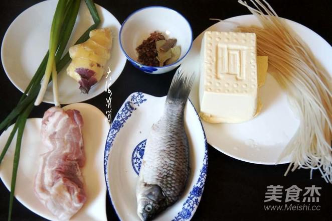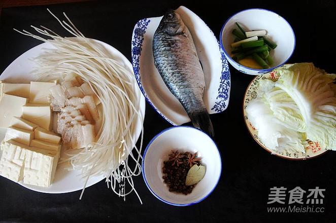 粉條提前冷水浸泡,蔥姜洗凈切段切片,魚去鱗去內臟去腮,洗凈去醒線打花刀,白菜洗凈切段,豆腐切片,五花肉切片