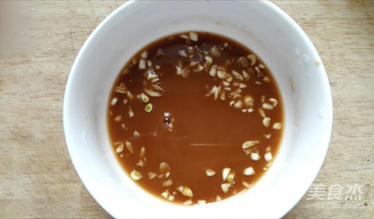 腌茄子的過程中,準(zhǔn)備碗汁。大蒜切末、料酒1勺、生抽2勺、糖2勺、醋2勺、鹽2克、淀粉1勺、適量水,調(diào)勻。