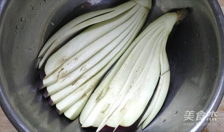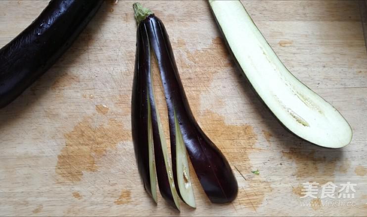 長茄子洗凈,縱切兩半,取其中一半,切面向下,再如圖豎切成一片片的,頂部不要切斷。