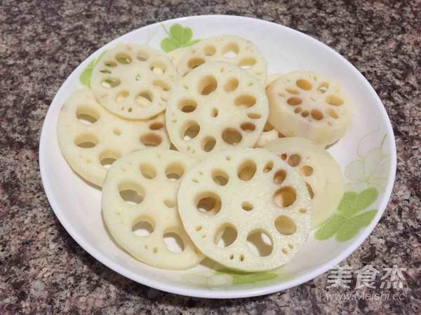 蓮藕去皮切厚片。