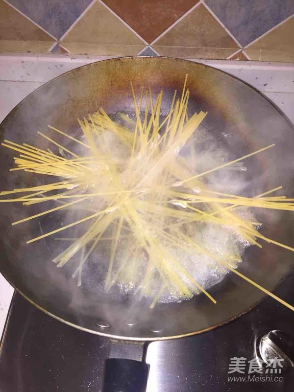 放適量意面入鍋,直到意面中間無白心,就可以起鍋,放冷水里冷卻以備用。
