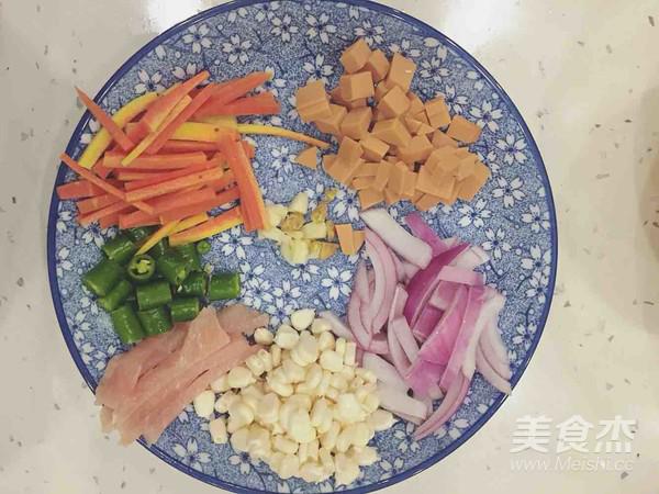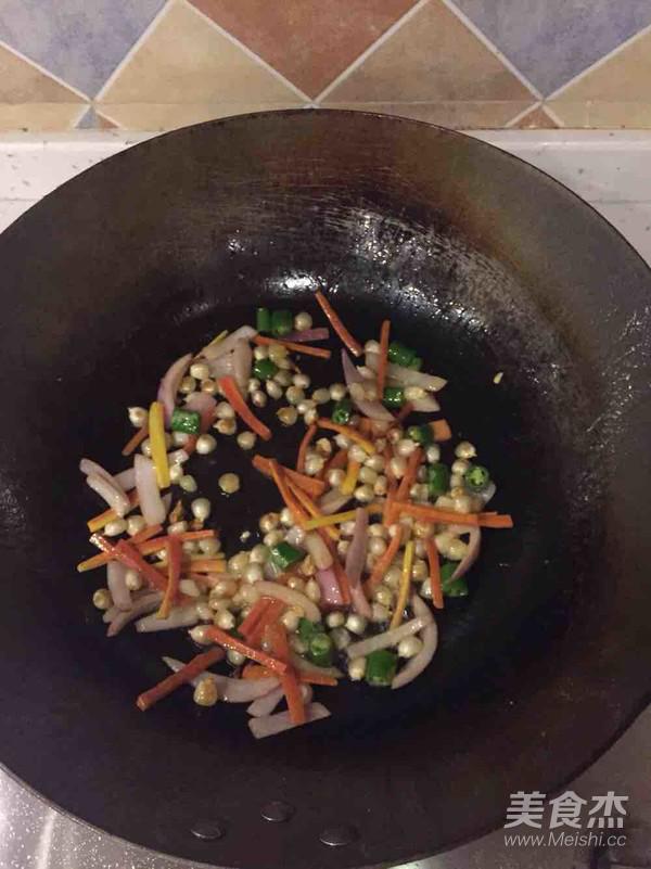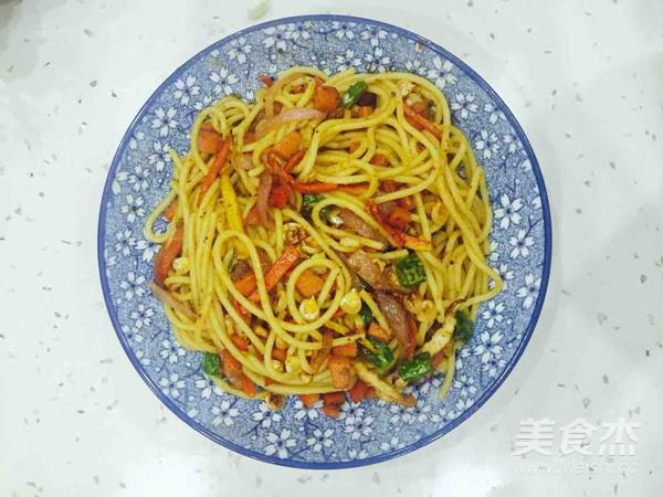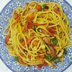 所有的配菜放油翻炒,先后順序以易熟的程度為主。再將所有意面放入鍋中,加入適量意大利醬。再翻炒起鍋。